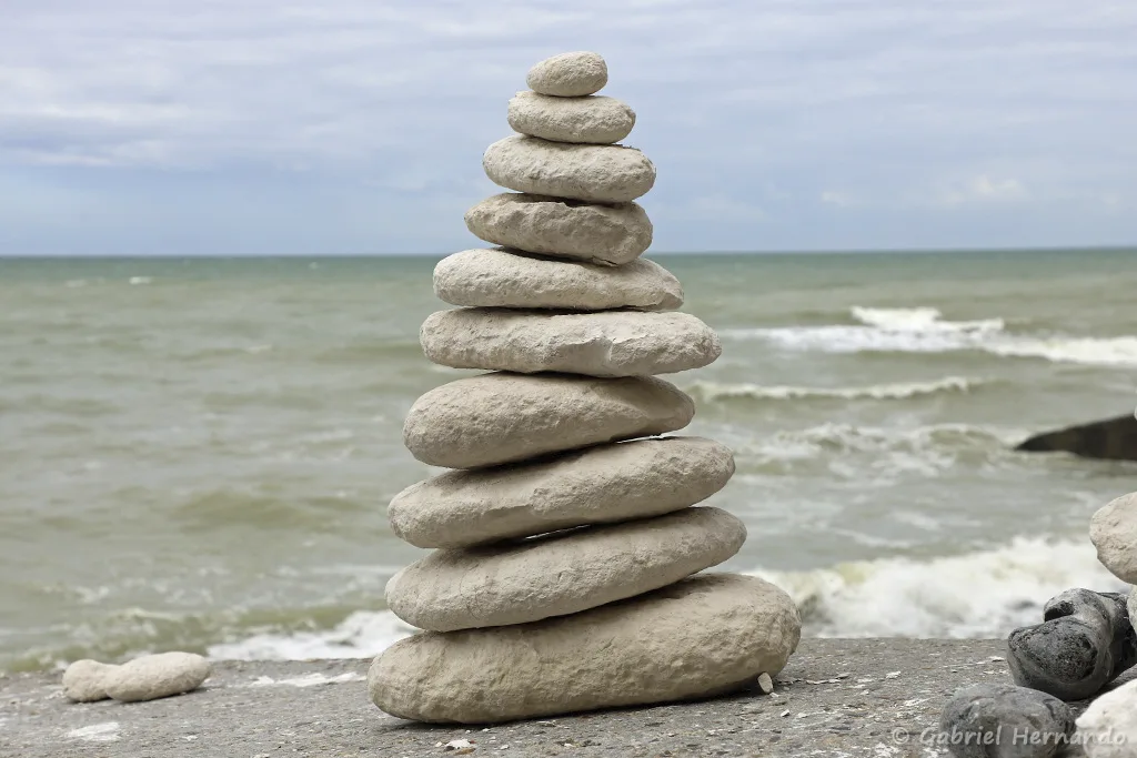 Stone stacking, cairn ou empilement de galets de calcaire (Bois de Cise, Ault, août 2021)