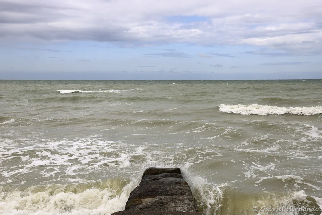 La mer montant sur un épi de béton (Plage du Bois de Cise, Ault, août 2021)