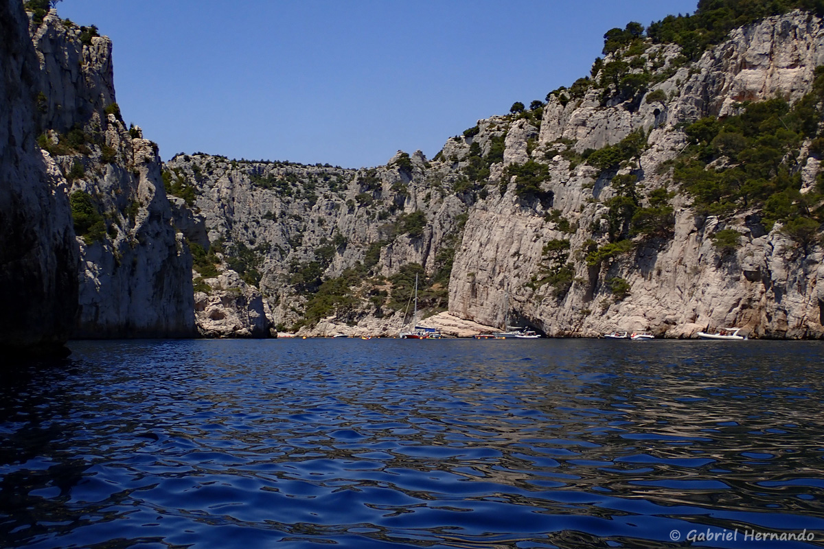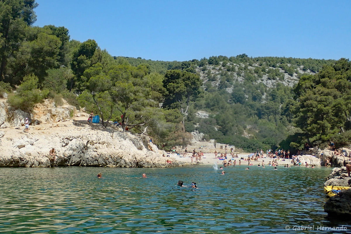 Nous pénétrons dans la calanque d’En-Vau, aussi belle que dans nos souvenirs de l’an passé. Il fait beau et la calanque est bien fréquentée. Nous nous dirigeons vers une zone de rocher et y amarrons le canoëavant de débarquer. Il est plus de 13 h et la fin se fait sentir et il est temps de sortir le pique nique.