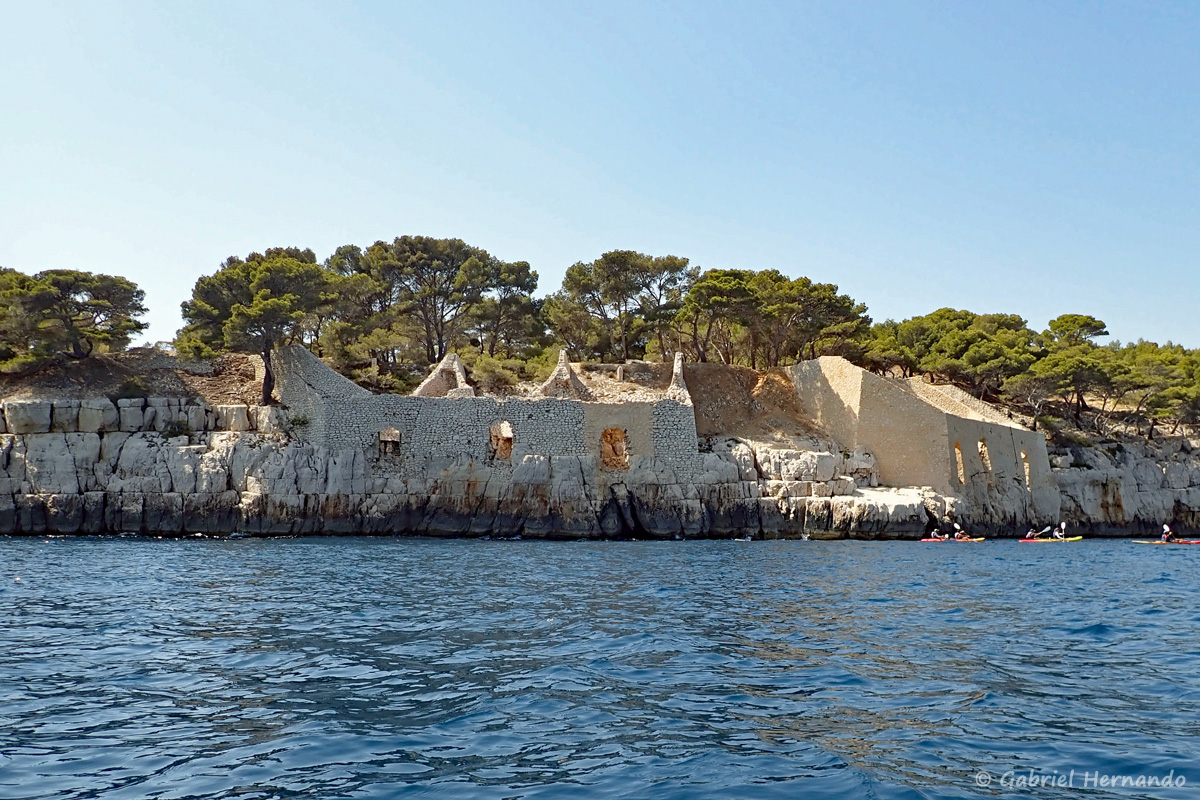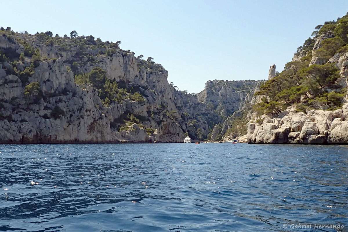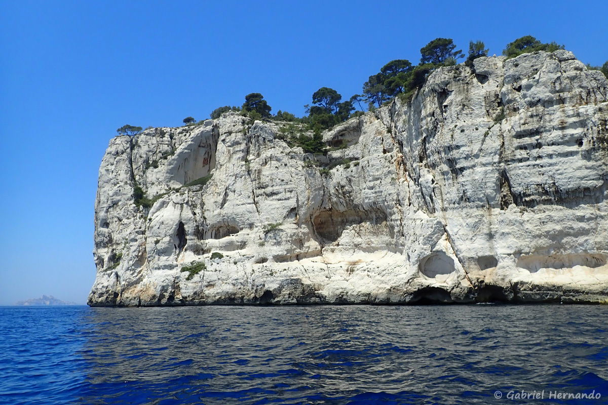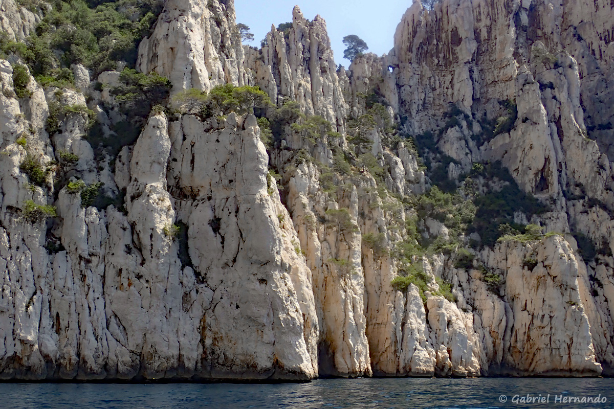 A 10h30, nous voilà parti de la plage et après avoir traversé le chenal d’accès au port de Cassis, nous longeons le rivage en direction des calanques. Nous passons la pointe Cacau et les vestiges des trémies des carrières de pierre, puis l’entrée de la calanque de Port Miou, pour rejoindre la calanque de Port Pin.