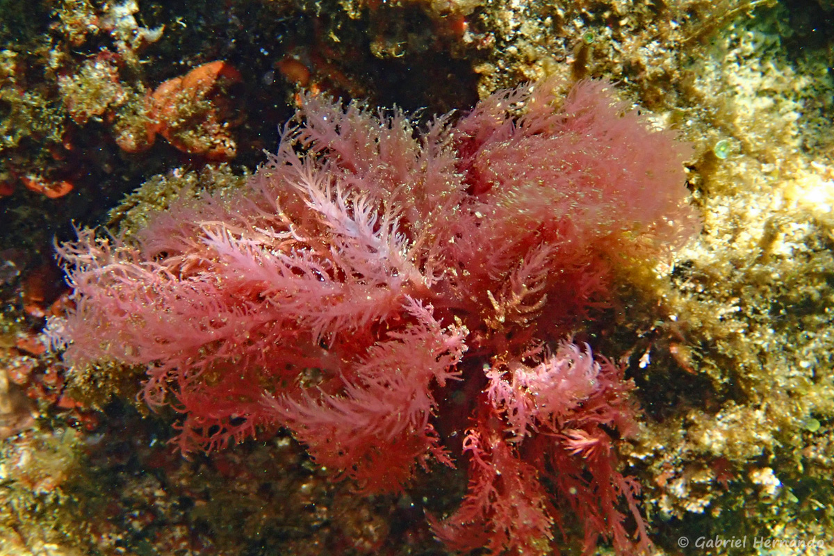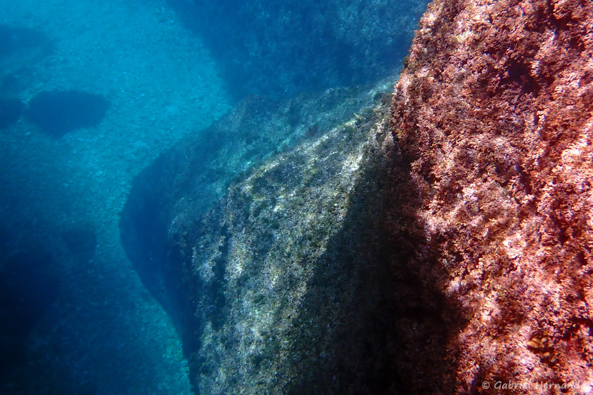 Une fois restauré, nous nous mettons à l’eau, pour un bon moment de baignade très agréable. Pendant plus d’une heure, je vais arpenter les tombants et le fond de la calanque, pour observer la vie sous-marine, appareil photo à la main. J’y observe une étoile de mer rouge (Echinaster sepositus), mais rate les photos. Il y a également de nombreux poissons, solitaires ou en banc, oblades (Oblada melanura), gobies mouchetés, triptérygions rouges (Tripterygion tripteronotum), Saupes (Sarpa salpa), mais aussi gireles, labres, castagnoles et un Apogon. Des saupes broutes en bancs, dans les massifs de Posidonies. J’observe également de belles algues, des anémones, oursins et nombreux habitants de la calanque.