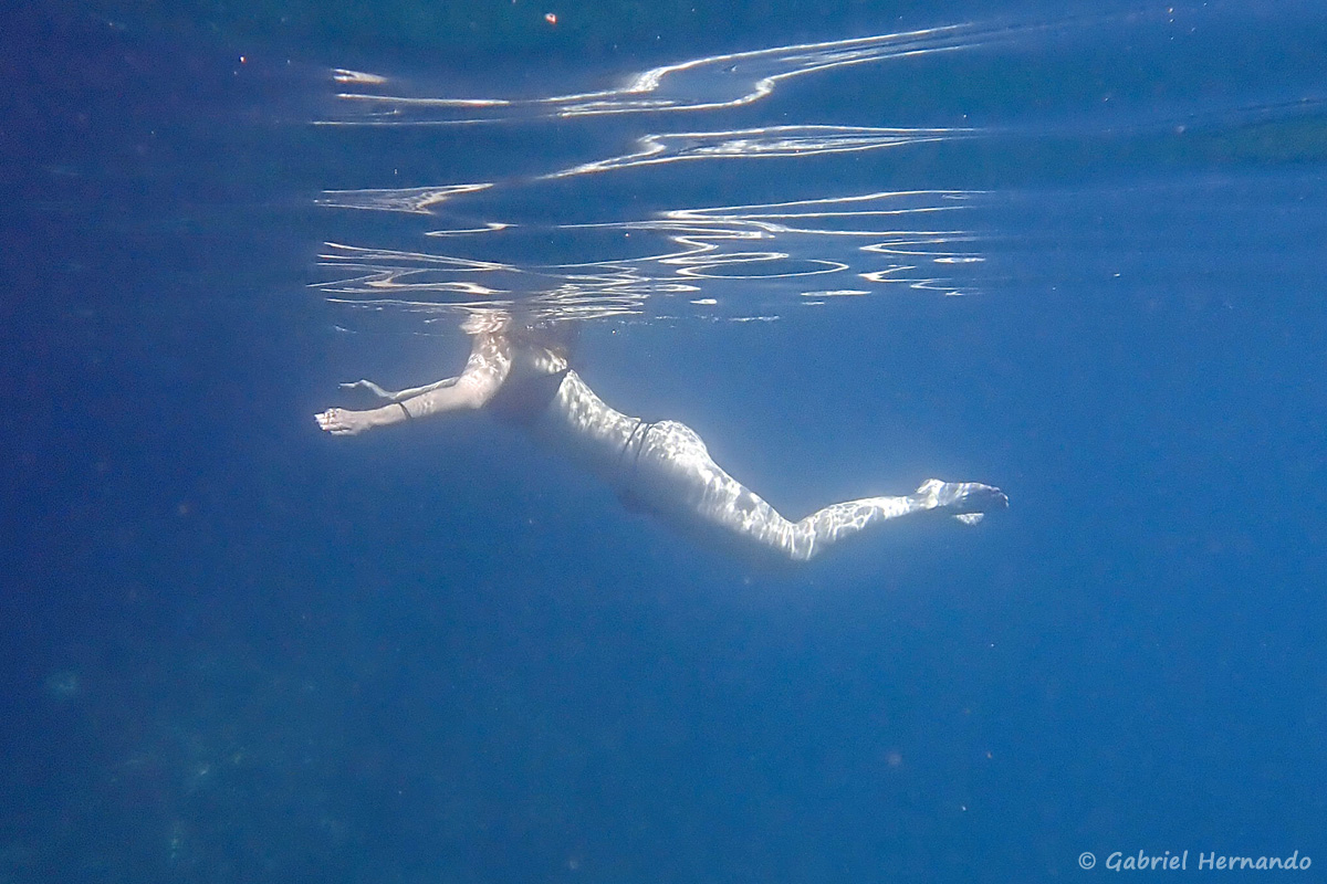 C’est le moment d’une petite pause pour se désaltérer. Il fait très chaud et l’eau turquoise est une invitation à la baignade. Le canoë est amarré et nous nous posons. Je me mets rapidement à l’eau, avec mon masque intégral pour observer ce qui se passe sous la surface et prendre mes premières photos. C’est l’effet Wahoo ! C’est magnifique ! Je ne vois pas bien ce que je photographie, à cause des reflets sur l’écran et déclencha de manière approximative.