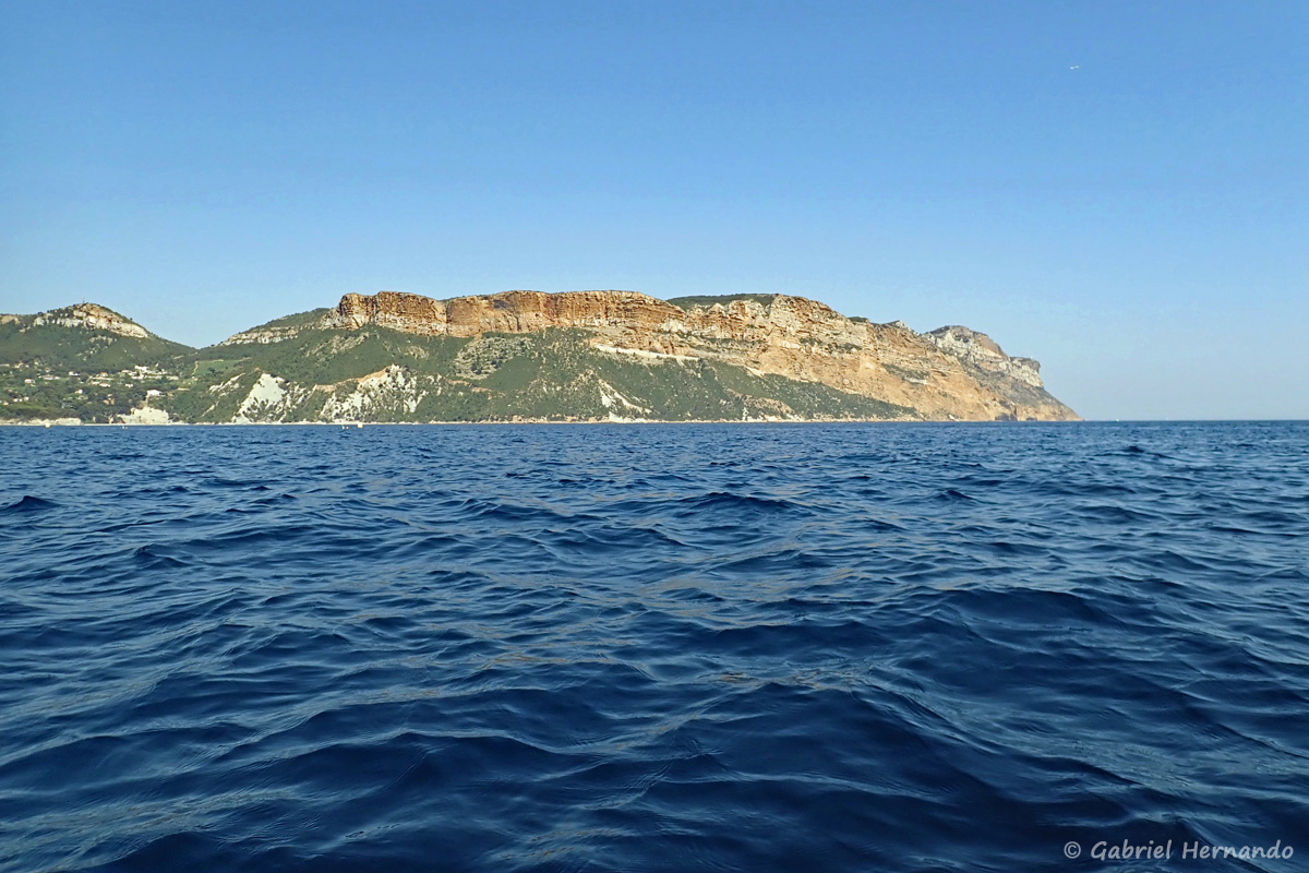 Il est 15h30 et il nous faut 1h pour rejoindre la plage de Cassis. Il est temps de se remettre en route et quitter à regret cette calanque. Le retour sera plus dur. Nous profitons du paysage, avec notamment le Cap Canaille qui nous fait face, avec ces magnifiques falaises éclairées par un soleil descendant.